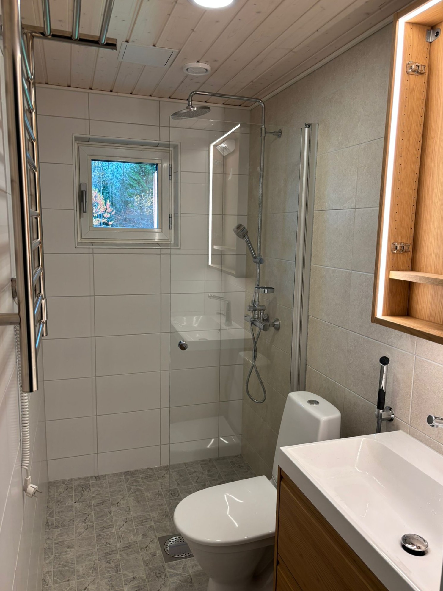 Kylpyhuoneremontissa vanha wc-tila koki täydellisen muutoksen. Tilaa laajennettiin noin metrin verran ja sinne tehtiin suihkunurkkaus. Kaikki pinnat ja kalusteet uusittiin ja samalla vanha lattialämmitys vaihdettiin uuteen. Remontin yhteydessä huoneeseen vaihdettiin myös tiiviimpi ikkuna ja ulkoseinään lisättiin eristystä.